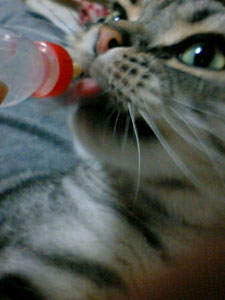 飼い主が哺乳瓶でお水をあげている(恥~)