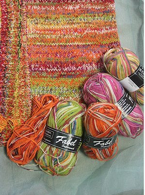靴下用の糸、いろいろをテキトーに2本取りにして編みました。