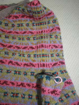 少し前に残り糸整理プロジェクトで編みこみ模様を輪針でグルグル編みました。