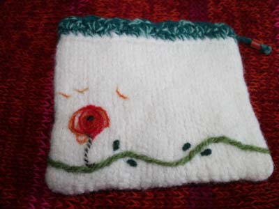 習得した 袋編み で 白いポーチ を編んでフェルト化した。